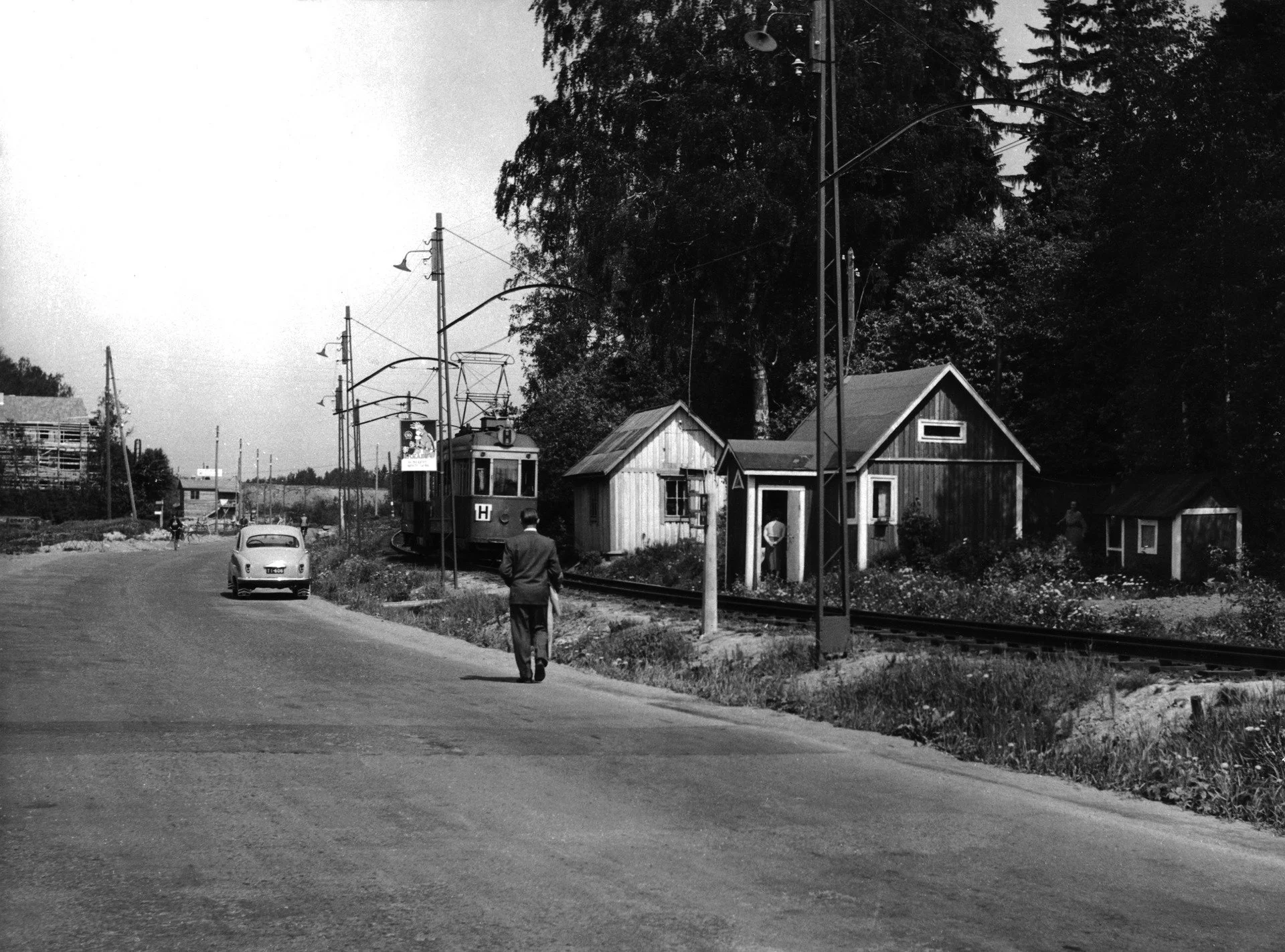 Spårvägslinjen på sina sista månader, tågbanans gamla rutt syns i horisonten (Constantin Grünberg, HKM)