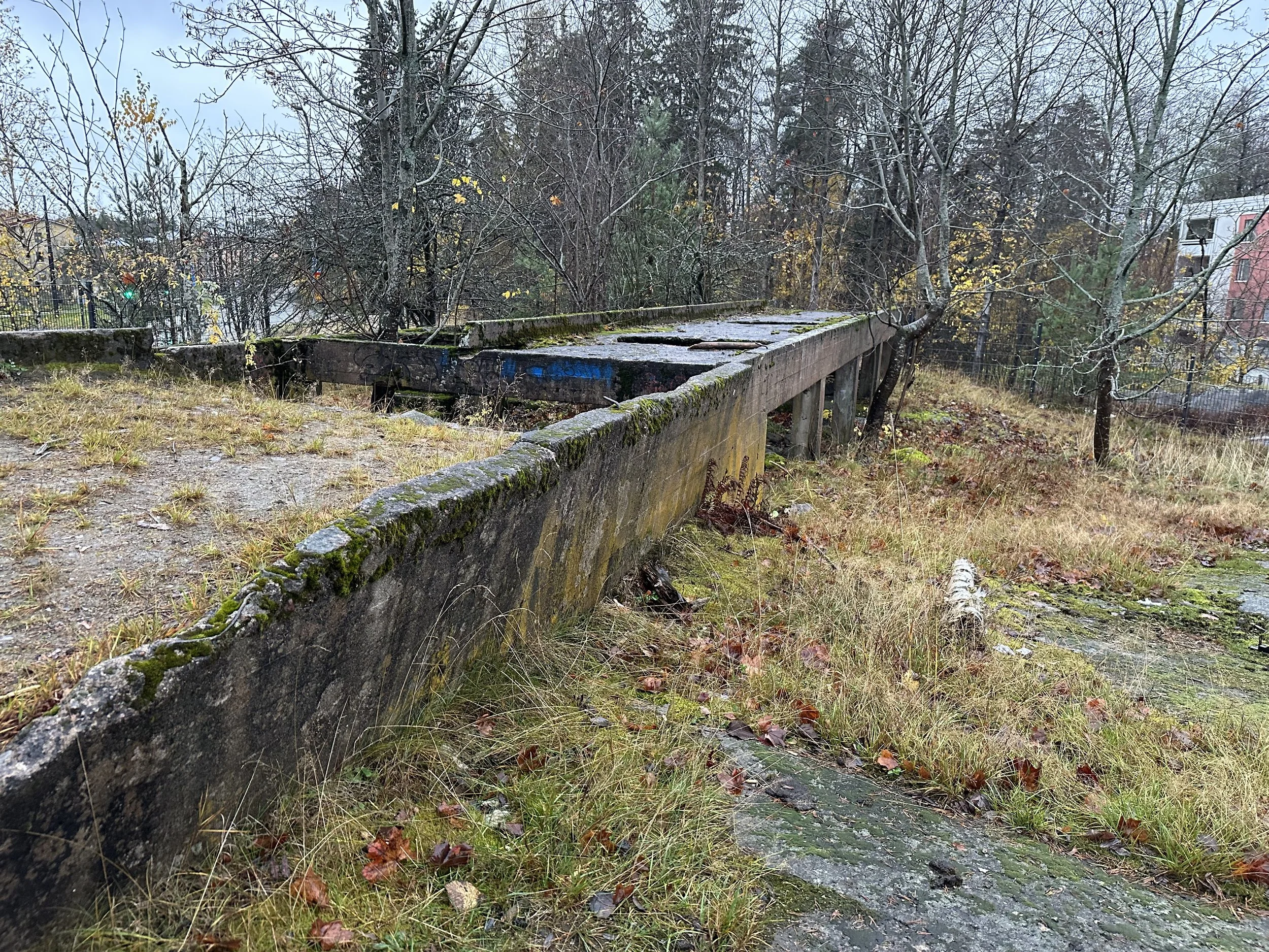 Betongstrukturen; Eliel Saarinens väg syns på andra sidan buskarna till vänster